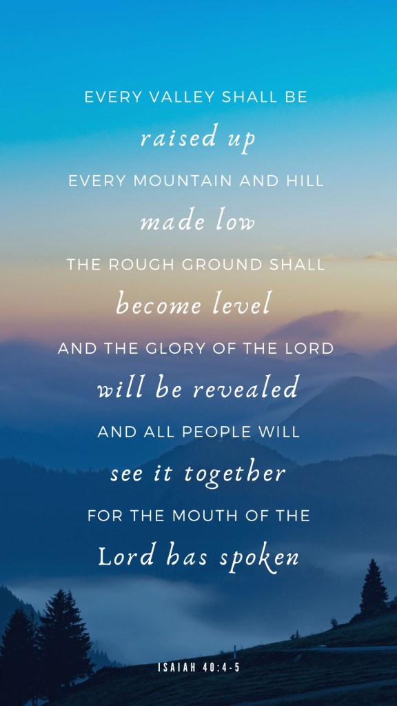 Every valley shall be raised up. Every mountain and hill made low. The rough ground shall become level. And the glory of the Lord will be revealed and all people will see it together. For the mouth of the Lord has spoken.